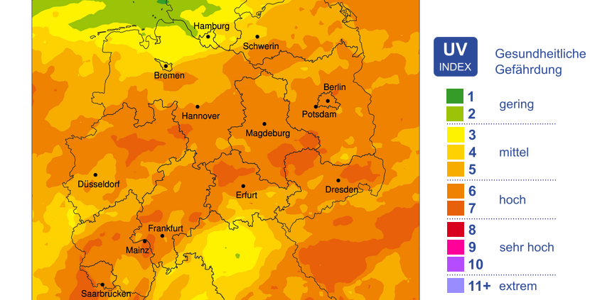 in DWD Wetter Gefahrenindizes - täglich aktuell/von Mein Genial VitalDer Gefahrenindex zur UV-Strahlung beruht auf der Einschätzung der erwarteten maximalen sonnenbrandwirksamen UV-Strahlung (UV-Index). Die berechneten Werte des UV-Index werden zur leichteren Beurteilung der gesundheitlichen Risiken in Gefahrenbereiche eingeteilt. Dem UV-Gefahrenindex sind in Anlehnung an die Empfehlungen der Weltgesundheitsorganisation WHO geeignete Maßnahmen zum Schutz der Gesundheit zugeordnet, die Sie auf der Seite „Erklärungen“ finden.